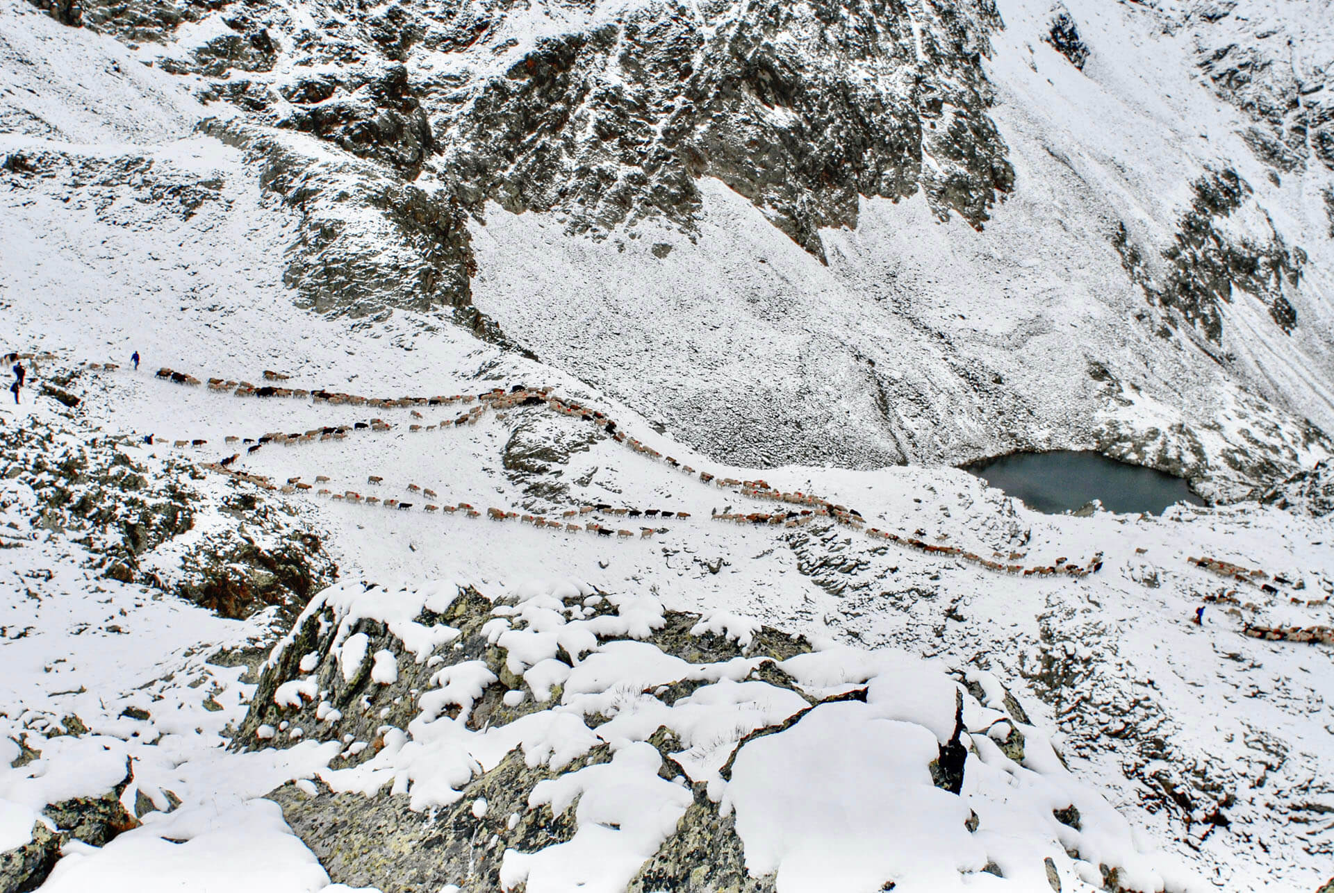 Il secondo luogo d’incontro tra le mandrie della Val Venosta e quelle della Val Senales si trova nei pressi del Lago di Vernago a 1.750 m di altitudine. Negli ampi recinti le pecore di Lasa hanno già trascorso la notte. Dopo aver risalito la valle Fallerbach e superato il Taschljöchl, ripartono per raggiungere il Niederjoch a 3.019 m e la Similaunhütte.Un’interessante lapide votiva conservata nella Chiesa della Madonna ricorda che qui avvenne un incidente nel 1694: “Nel 1694 stavo conducendo le pecore al giogo e caddi in un crepaccio, invocai la Madonna e mi salvai e le ha dedicato questa targa in segno di ringraziamento. Georg Kofler.” Ma questo non è stato né il primo né l’ultimo incidente. Il 16 giugno 1979 il tempo inizialmente brutto si trasformò presto in un temporale. Sette pastori con 250 pecore non sono più riusciti ad andare avanti e hanno chiesto aiuto. L’oste Leo Gurschler von Kurzras ha portato i soccorritori con il suo elicottero con grande rischio e sono riusciti a salvare i sette pastori e 152 pecore. Anche le pecore ormai decedute sono state salvate in elicottero e successivamente riportate a valle. Tuttavia non ho trovato alcuna traccia di questo tragico episodio!
