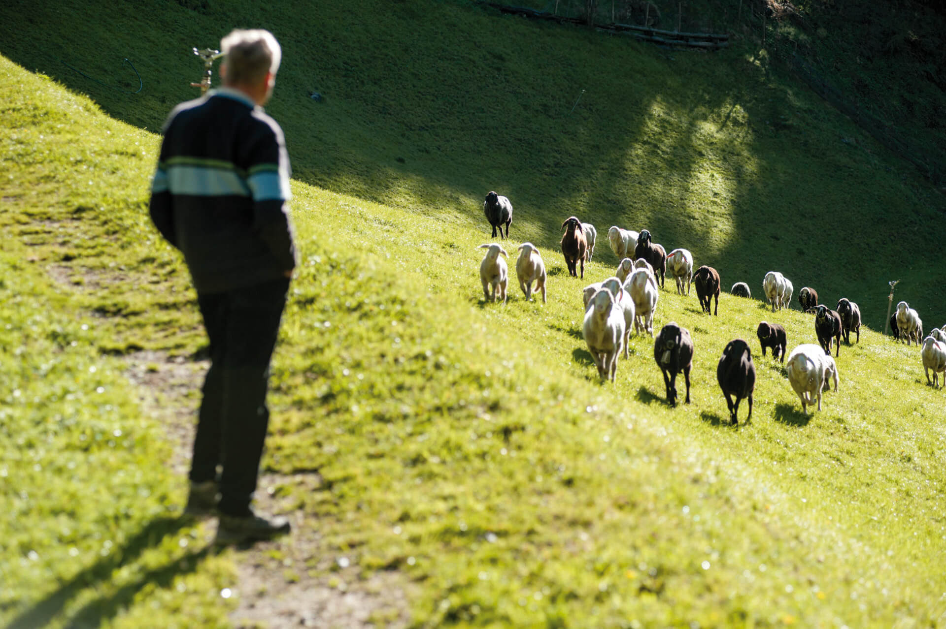 Faccio sempre il mio giro, una volta attraverso i prati, una volta in alto. Porto anche il sale alle mandrie. Ho allestito ovunque piccole capanne di sale (casette). Sto osservando bene le mie pecore. Portavo da solo cinquanta chilogrammi di sale sulle spalle. Per ore senza riposarsi. Oggi non posso più farlo. L’età. Se non hanno abbastanza sale, corrono dietro agli escursionisti e poi salano. Questo non è da sottovalutare quando un branco come questo si precipita verso di te.